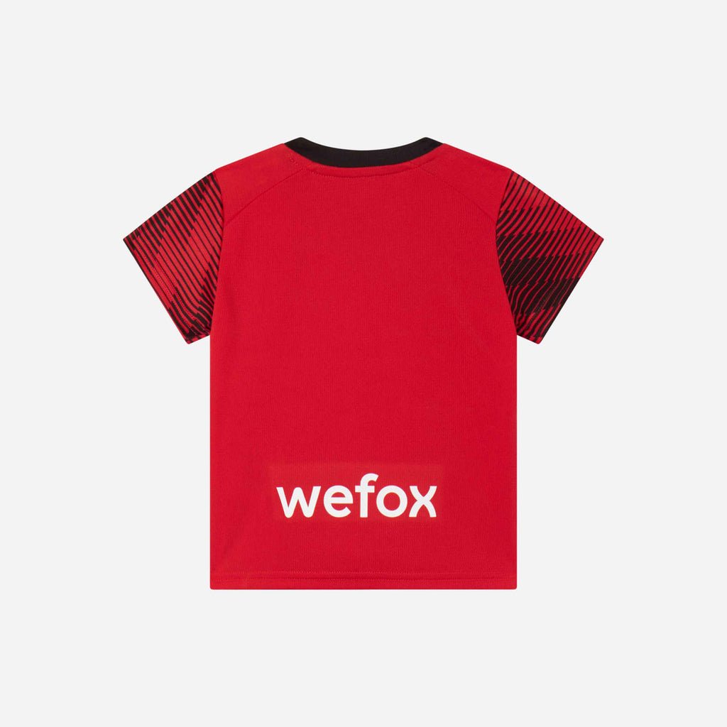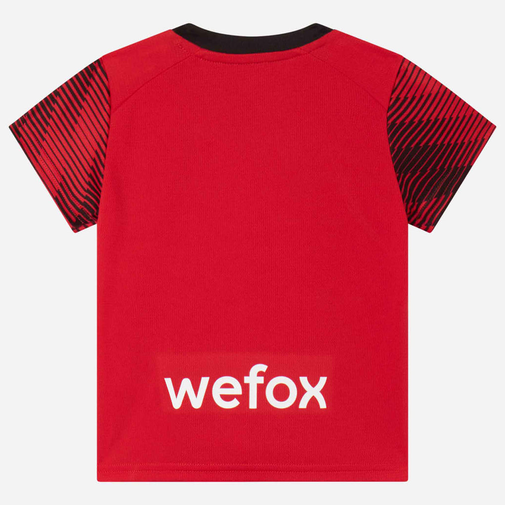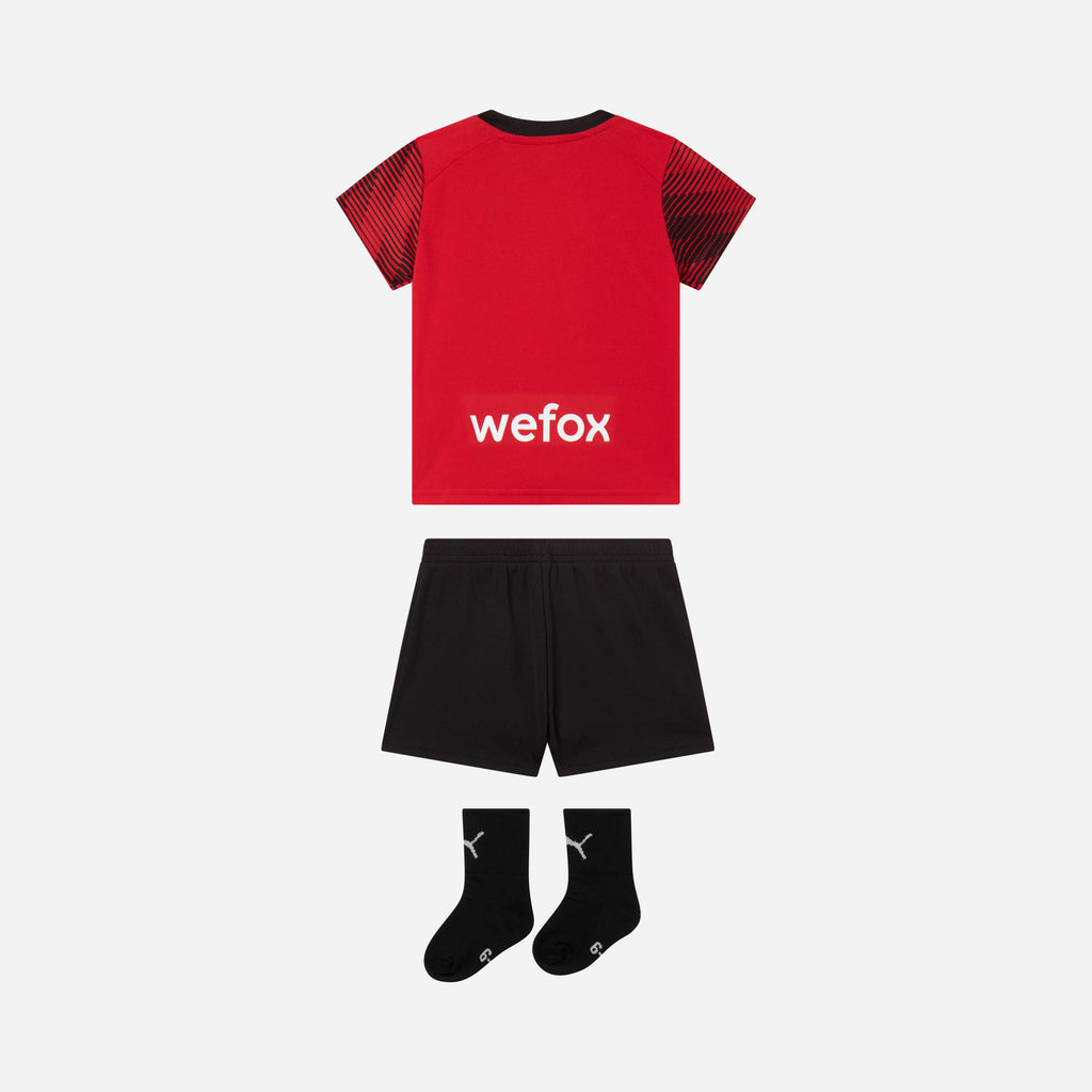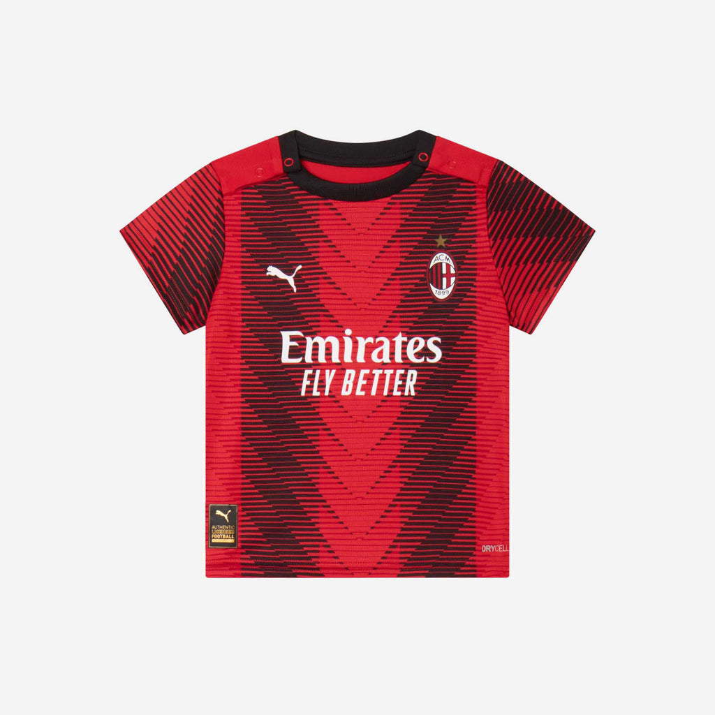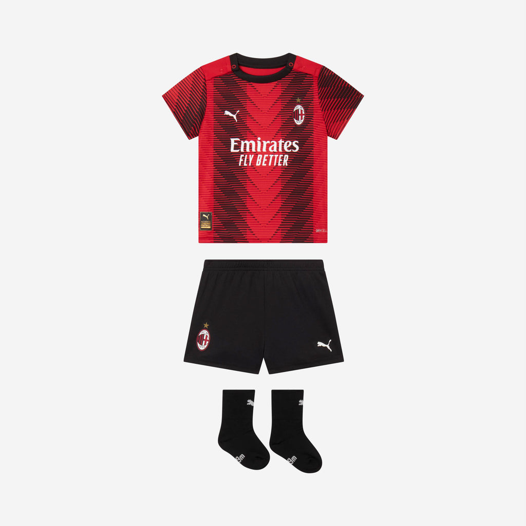 Kit gara AC Milan Home da neonato della stagione 2023/24 composto da maglia, pantaloncini e calzini.